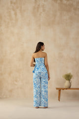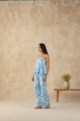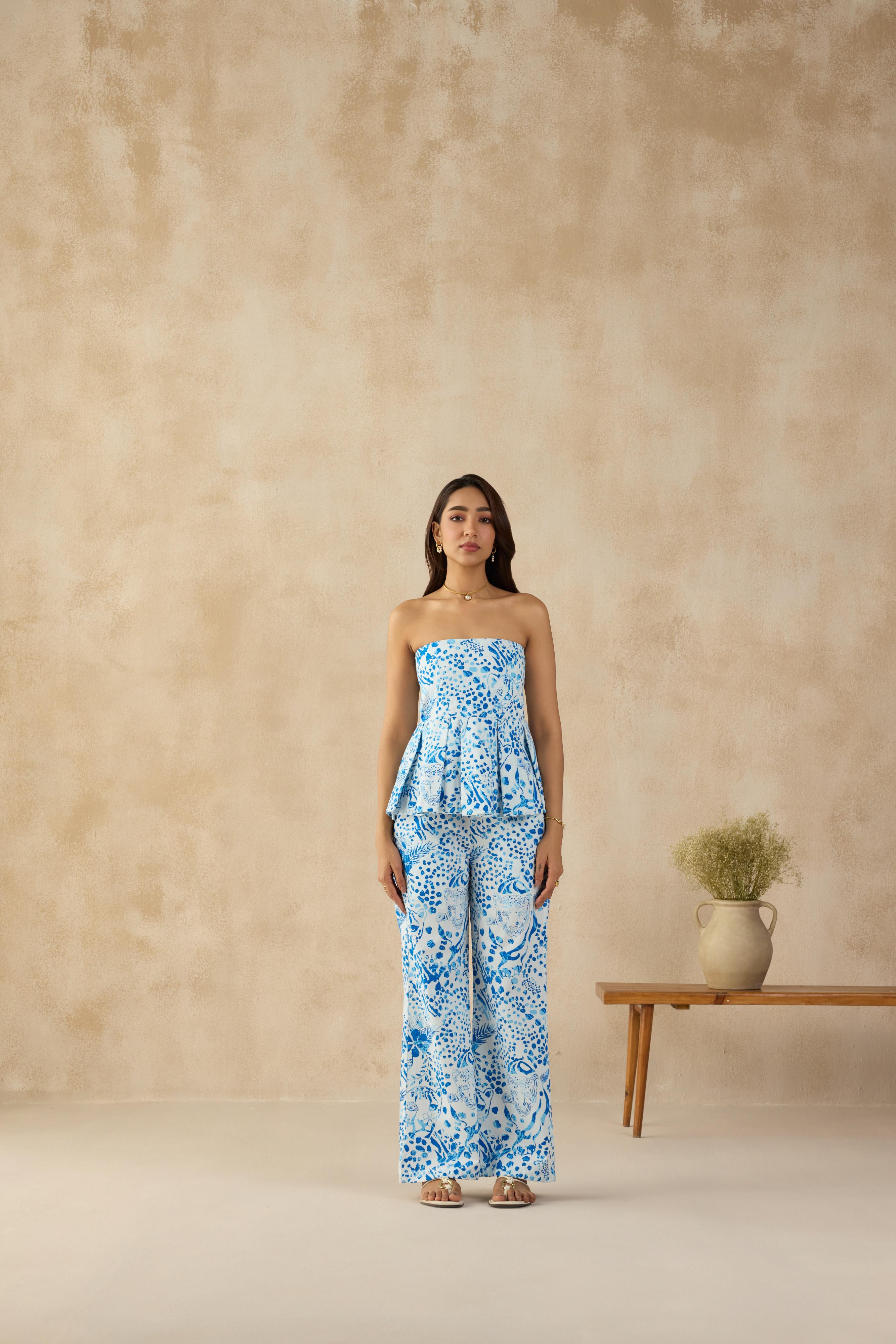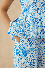 Embrace the chic comfort of the Naples Co-ord, crafted from breathable poplin cotton that feels light as air. Featuring a sleek pair of straight pants and a flattering peplum top, this set redefines effortless style. The serene blue and white palette adds a fresh, sophisticated vibe, making it perfect for brunch dates or coastal getaways. Featuring our signature panther print, the Miami Set keeps you cool and stylish all day long.